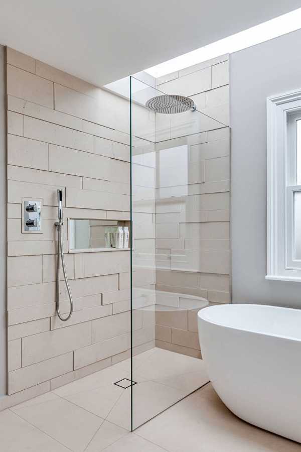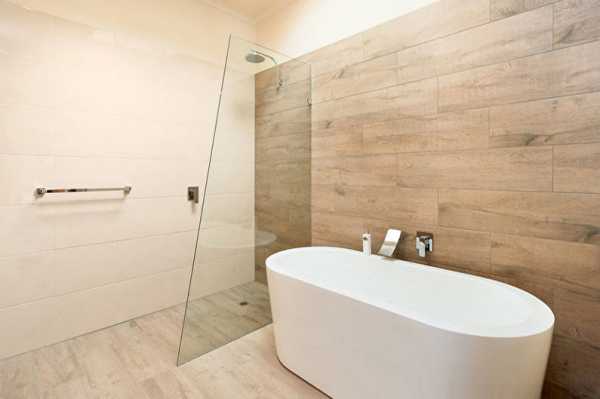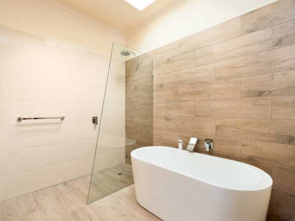 В просторных ванных комнатах можно комбинировать плитку с другими материалами. Например, покрыть стены штукатуркой или деревянными панелями в области с меньшим уровнем влажности. Для встроенной душевой кабины нередко используют мозаику.