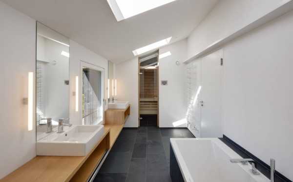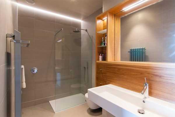 Чтобы равномерно осветить каждый участок помещения, необходимо продумать многоуровневую систему освещения. Она включает центральную часть (встроенные в потолок светильники, бра) и локальную (освещение над зеркалом, в душе).
