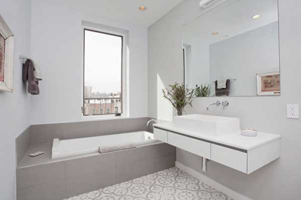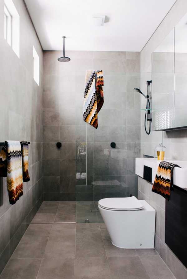 Ванная комната любых габаритов будет выглядеть просторно, если подобрать лаконичную палитру оттенков. Наличие окон и естественного света только усилит эффект, а искусственное освещение придаст современный вид.