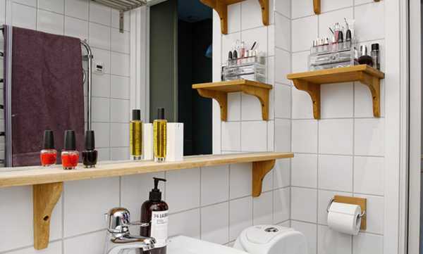 Шкафчики при возможности необходимо встроить в стену. Также можно предусмотреть нишу для стиральной машины. В дизайн ванной в скандинавском стиле отлично впишутся вещи, сделанные своими руками. Например, деревянные полки, небольшой табурет или вешалка для полотенец.