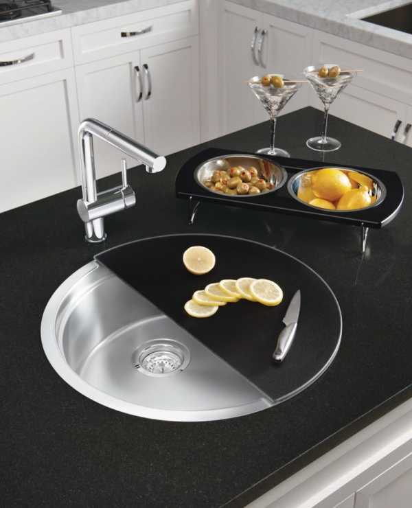 Мойка черного цвета, врезанная в белую столешницу, создает визуальное впечатление глубины и объема, привлекая внимание и в то же время смотрясь достаточно лаконично. На белой столешнице более заметны загрязнения, что является единственным минусом этого дизайнерского решения.