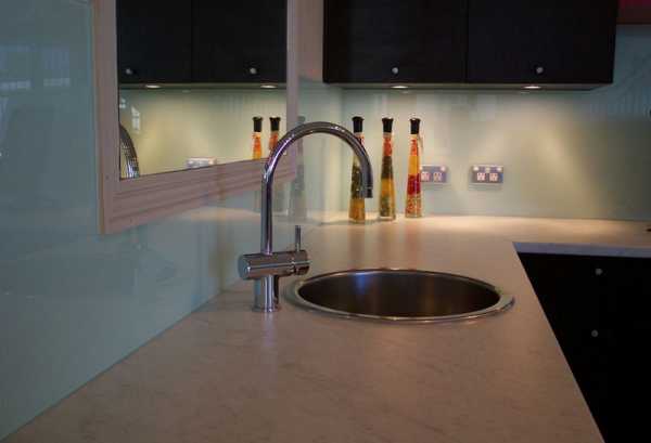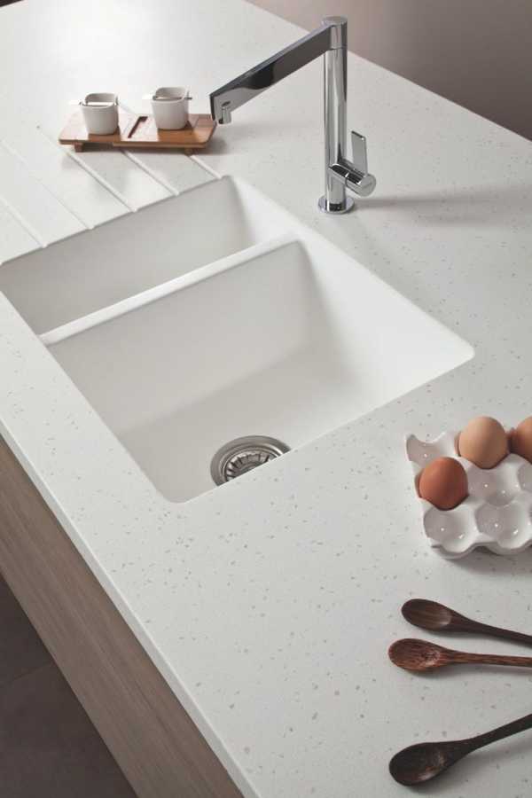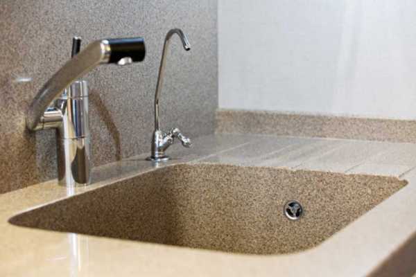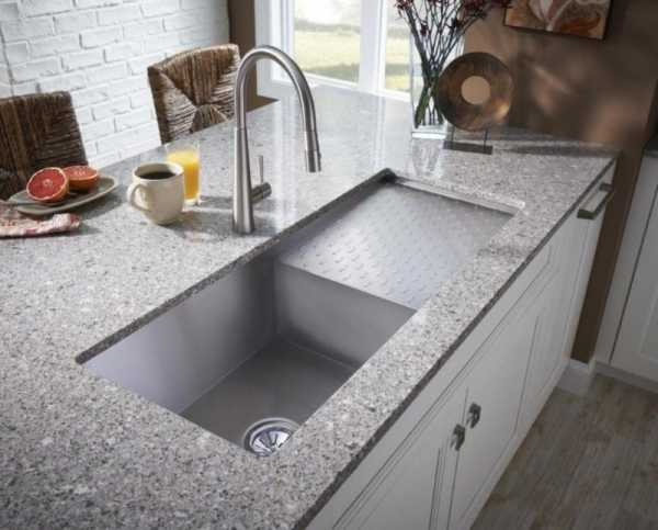 Пластиковые или каменные столешницы прекрасно будут сочетаться с интегрированными раковинами. Они позволяют создать общее пространство в рабочей зоне. Но при установке требуется монтаж в сам материал столешницы, что сложно сделать без привлечения специалистов.