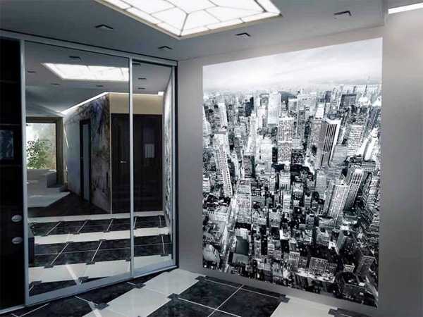 Ещё есть способ визуально исправить пропорции прихожей при помощи фотообоев. Сделать комнату шире можно оклеив стены панорамными фотографиями холодных тонов, а сузить пространство помогут фото тёплых оттенков.