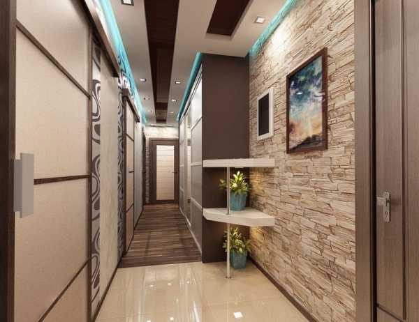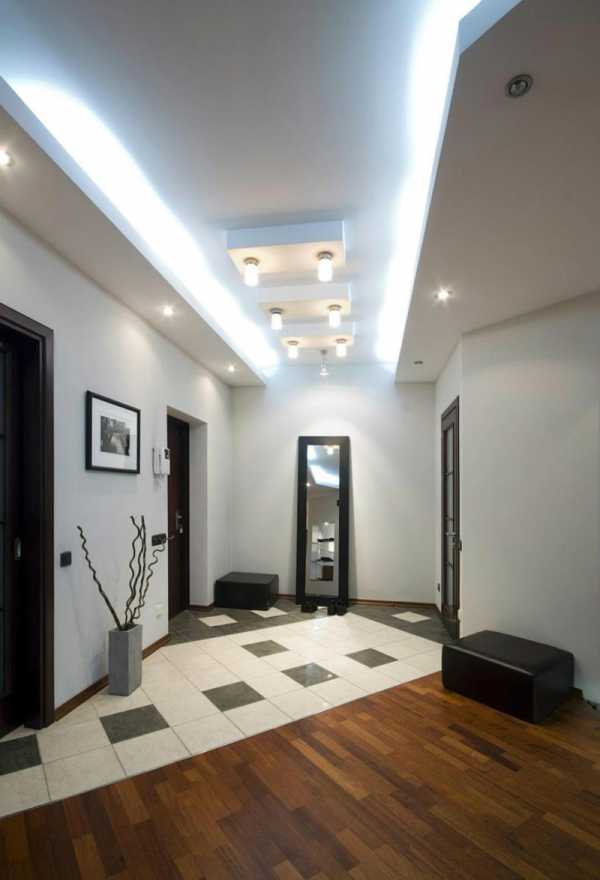 Освещение играет важную роль. Коридор без светильников кажется темным. Поэтому желательно установить мощные источники света под потолком.В длинном коридоре можно разместить несколько ламп в ряд. Чтобы лампочки не святили в глаза, – приобретите абажуры.