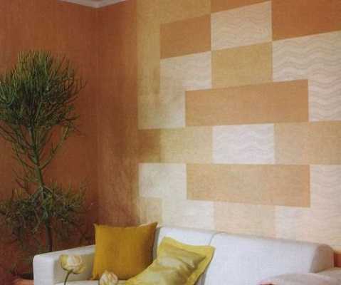 Можно использовать и цветные вставки – это имитация декоративных интерьерных панелей. Но нужно особенным образом подготавливать поверхность. Вначале стена красится в цвет-фон, затем выполняется разметка и после высыхания создаются нужные узоры.