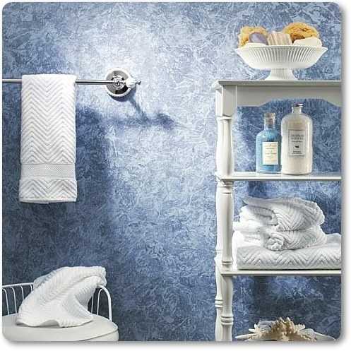 При такой технике стены сначала окрашивают в более светлый оттенок, а затем валиком наносят яркий цвет. В результате на стенах получается некий эффект мраморной поверхности.