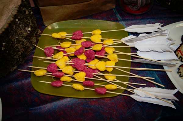 Жевательный мармелад нанизала на палочки для минишашлыков и украсила простой белой бумагой типа стрелы. А вот настоящие перья примотала к тем же палочкам проволкой и воткнула в маршмелоу с шоколадом и орехами.
