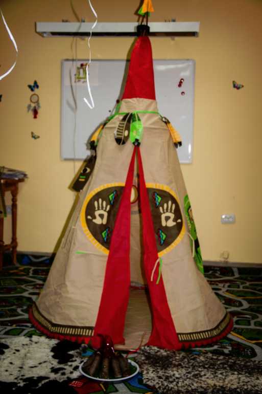 Для антуража и в подарок имениннику купила вигвам. Сначала планировала из дерева, сейчас очень модный бизнес в интернете оказывается пошив вигвамов, но прочитала что не стойкие, а на ораву детей травмоопасно. Поэтому какие бы ни были они красивые купила вигвам типа игровой палатки, там каркас пластиковый, собирается быстро из маленький трубочек. И легкий ( и дешевле раза в два)... Дети просто использовали вигвам для игр, постоянно ныряли туда )))