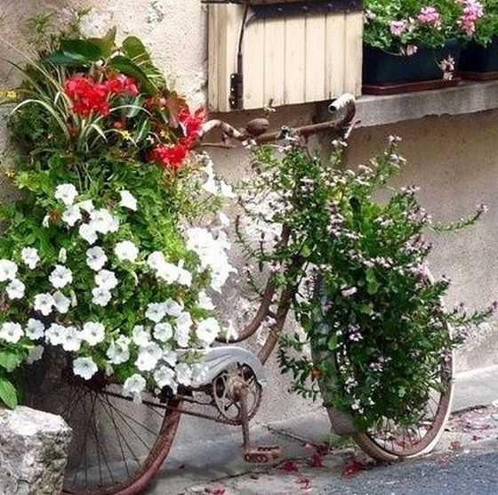 Они не сами по себе красивы, прекрасны цветущие растения, для которых велосипеды служат подставками. Такие «процветшие» велосипеды могут украсить любую скучную глухую стену, и как видим, выглядят очень даже привлекательно. Кстати, хороший ориентир для гостей, точно долго ваш участок искать не будут, как эти, например.