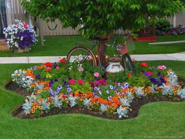 Но есть одно решение, которое используется многими, но оно столь многообразно, что трудно найти полностью совпадающие образцы. Речь идет о клумбе из велосипеда, точнее об использовании старых велосипедов в качестве цветочных клумб.