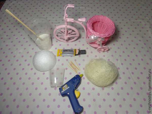 Чтобы сделать велосипед с цветами, понадобится капроновая нитка. Возьмите трубочки для коктейля, упаковку клея, картон, а также инструмент – ножницы. Приготовьте бусины, небольшой горшок. Для декорирования изделия купите разные по цветовой гамме ленты. Также можно использовать пайетки.