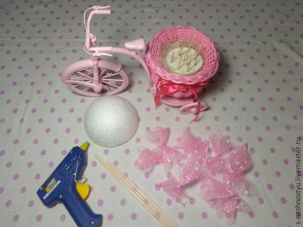 Украшаем края велосипеда органзой (заранее мы сложили фунтики из органзы).