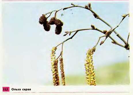 Первой в средней полосе европейской части СССР зацветает ольха серая. Цветки ее невзрачны, но распустившиеся сережки из тычиночных цветков хорошо заметны 123. Стоит только дотронуться до ветки ольхи с сережками, как ветер подхватывает целое облачко желтой пыльцы.