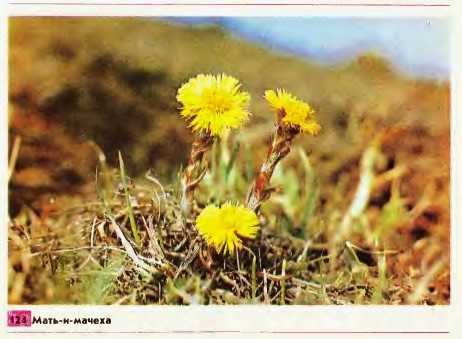 Чуть только стает снег, а уже появляются ее чешуйчатые стебли — цветоносы с ярко-желтыми соцветиями, похожими на соцветия одуванчиков 124 . Крупные листья мать-и-мачехи вырастают после того, как созреют и рассеются ее пушистые плодики.