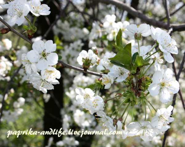 Вишня обыкновенная -дерево с широкой, раскидистой кроной. Цветки на длинных цветоносах собраны в белоснежные зонтиковидные соцветия с легким ароматом. Распускаются в мае. цветение может продолжаться две недели.