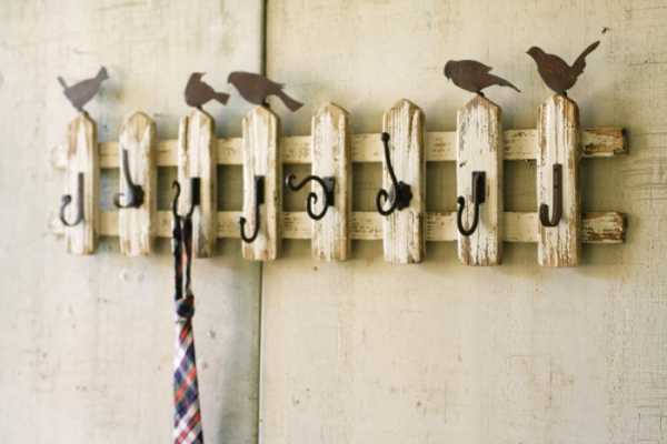 Если есть возможность, то можно вместо крючков использовать сучки деревьев, которые прикручиваются к планке. Делать это не обязательно в одной плоскости – можно расположить крючки в хаотичном порядке. Такое расположение придаст оригинальности вешалке.