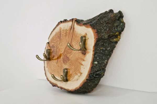 Такую вешалку можно изготовить из срезов дерева разного диаметра. Если в саду необходимо избавиться от старого плодового дерева, можно подарить ему вторую жизнь таким образом. Конечно, древесина должна быть не гнилой и без больших трещин.