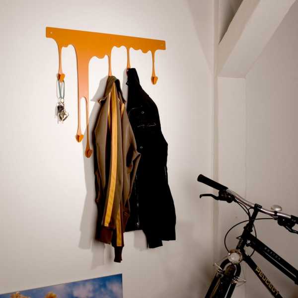 В дизайне вешалки в прихожую могут быть использованы такие необычные элементы, как металлические трубы, вентили, крюки. Сами крючки могут быть выполнены в виде рук, прищепок, клавиш пианино