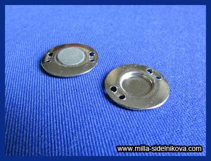 Магнитная пуговица состоит из двух деталей. На каждой из деталей есть по 4 сквозных отверстия для её пришивания к изделию в отведённом месте.