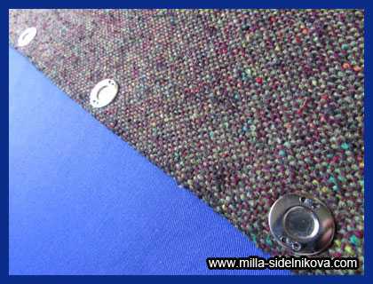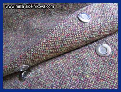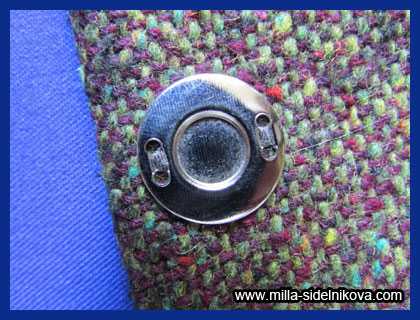 На левую сторону полочки, одна часть магнитной пуговицы пришивается через все слои материала. А вот на правой части полочки, деталь пуговицы нужно пришивать так, чтобы с лица никакого присутствия пуговицы видно не было. Для этого пришивать часть магнитной пуговицы на правый подборт следует до выполнения на изделии подкладки.