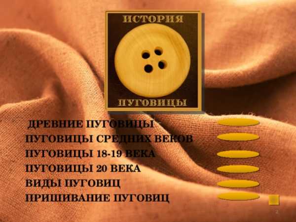 Презентация рассказывает учащимся об истории возникновения пуговицы, о классификации пуговиц, их назначении и применении в быту. С помощью данной презентации ученицы научатся подбирать пуговицы (по виду, назначению, цвету, форме, размеру), нитки, способы пришивания пуговиц. Закрепляя полученные знания практическим заданием.