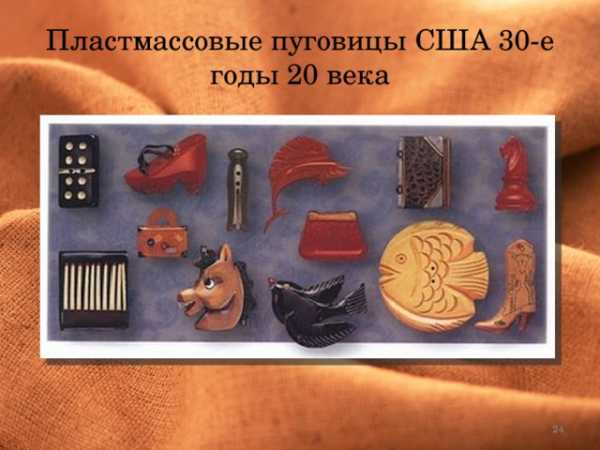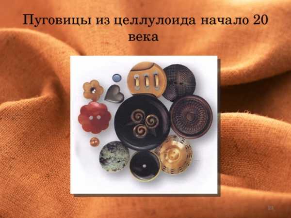 К нашему времени человечество научилось делать пуговицы из металла, из самых разнообразнейших синтетических материалов, из пемзы, стекла и фарфора, из дерева и кожи — натуральной и искусственной, а также из рогов животных.