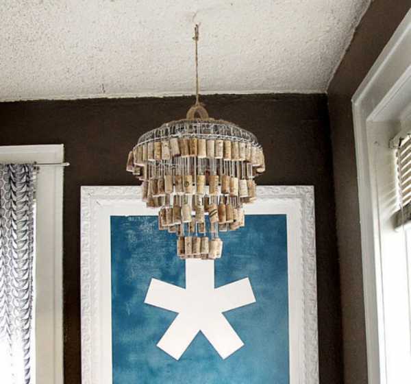 Одна из самых необычных идей, которую мы нашли, — преобразование пробок в подобие люстры. Подобие потому, что это скорее инсталляция, призванная украшать помещение, а не освещать его.