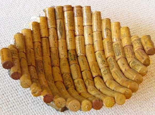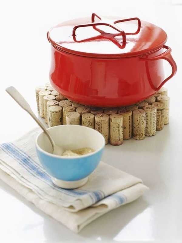 Винные пробки могут служить идеальной подставкой под горячее, если организовать их в фигурное панно. Они не боятся тепла и не деформируются. Нам больше нравится вариант, когда они соединены с помощью клея вертикально: подставка получается высокой и вероятность, что вы повредите стол или текстиль, сильно уменьшается. Если соединять пробки горизонтально, понадобится меньше пробок и подставка будет больше по размеру.
