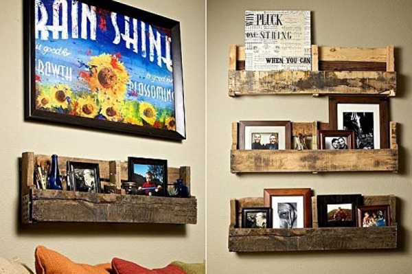 Полки, сделанные из поддонов своими руками, выглядят необычно и изящно. Они будут хорошо смотреться в любом помещении. Их можно изготовить для декора помещения либо приспособить для определённой цели: поставить статуэтки или бутылки с вином, хранить инструменты или книги.