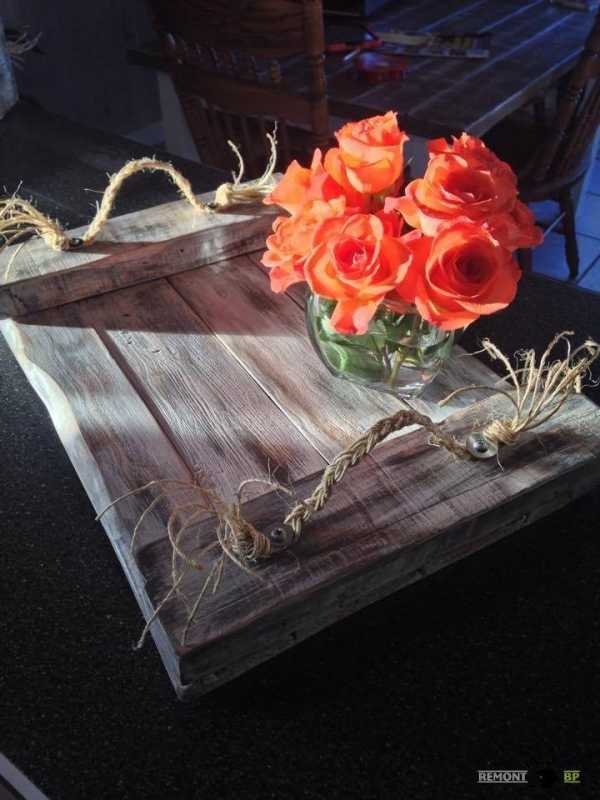 Всего лишь несколько коротких досок, сбитых вместе с помощью невысоких бортиков и пара ручек по бокам – готов оригинальный поднос, который вы можете использовать в ситуациях, когда необходимо поднести что-либо, например, завтрак в постель.