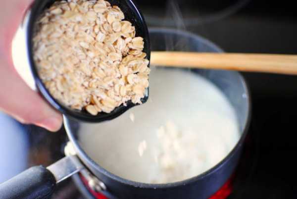 - В кастрюлю заливаем молоко, ждем, когда оно закипит, добавляем овсянку.