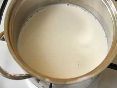 Налейте молоко в кастрюлю и поставьте на медленный огонь.