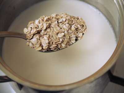 - Указанное количество молока доводим до кипения, засыпаем перемолотый овес, приправляем специями по вкусу и варим несколько минут.