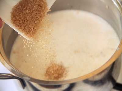 - Молоко поставить на плиту, заправить специями (небольшим количеством сахара и соли), довести до кипения и добавить в него сухие хлопья.
