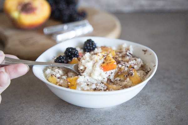 Перечень продуктов: 40 г овсяных хлопьев, 60 г нежирного творога, 30 г ежевики, 1/2 часть персика, 2 ст. ложки меда и шоколад.