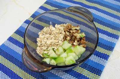 Нарежьте яблоко небольшими кусочками, порубите орех и сложите их вместе с хлопьями в одну глубокую посуду.