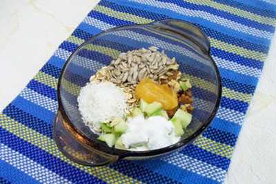 Состав продуктов: геркулес – 3 ст. ложки, сухие сливки – 2 ст. ложки без горки, яблоки – 2 шт., мед – 2 ст. ложки, а также семечки подсолнуха и кокосовые стружки – по 2 чайные ложки. Как приготовить мюсли на завтрак
