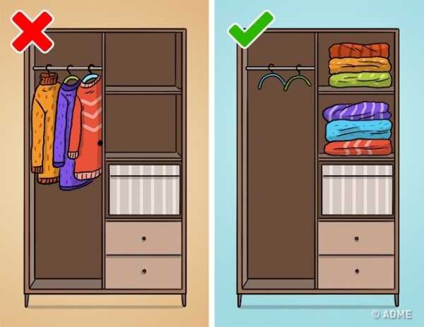 Трикотажные и шерстяные вещи нельзя хранить на вешалках — так они вытягиваются и теряют форму. Для хранения мягких пушистых свитеров лучше всего подойдут подвесные полки из ткани с узкими делениями. Шерстяной свитер идеально себя чувствует в сложенном состоянии на отдельной полочке. Тяжелая стопка вещей сверху образует на нем заломы.