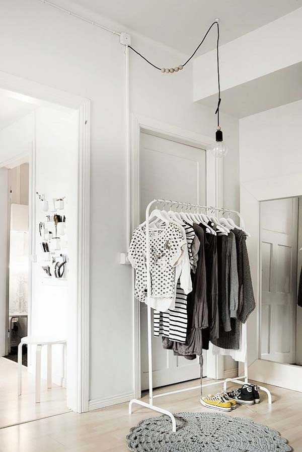 Если вы поклонник минимализма, у вас мало вещей, то можно обойтись одной напольной вешалкой с одной штангой.