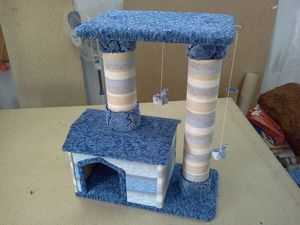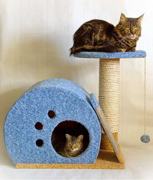 Продолжая серию о мебели для кошек, мы переходим от простого к более сложному. В этой статье мы расскажем, как сделать мини-комплекс для кошки: домик с двумя когтеточками, [лежанкой](http://www.diy.ru/post/4235/) и игрушкой. Такой комплекс хорошо подойдет как для взрослой кошки, так и для котенка или кошки с котятами. Домик будет достаточно просторным для крупной кошки или кошки-мамы с детьми, а наклонная когтеточка позволит котятам забираться наверх и учиться точить когти в специально отведенном месте, а не о домашнюю мебель.