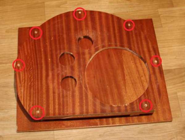 Кладем наши усеченные круги друг на друга, чтобы они лежали точно один над другим. Отмечаем семь точек, в которых стенки будут скрепляться рейками. Чтобы было легко найти эти точки на обеих стенках, сверлим тонким сверлом отверстия сквозь обе стенки. Можно просто вкрутить и выкрутить саморез.