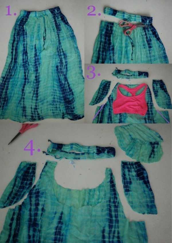 Раскладываем юбку на ровной поверхности и обрезаем резинку на поясе. Прикладываем к юбке майку и вырезаем по контуру проймы и декольте. Сшиваем шлейки с помощью иголки и нитки. Можно для надежности воспользоваться швейной машинкой. Подвязываем поясом и платье готово!