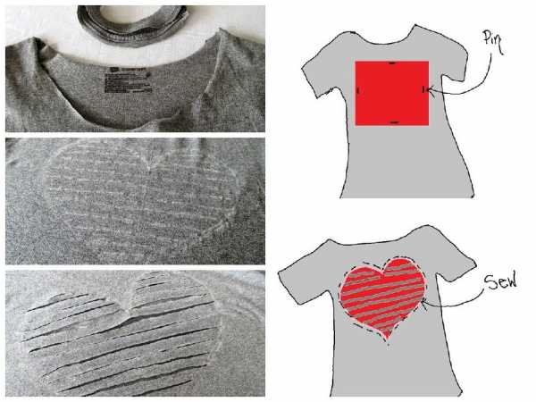 Сначала отрезаем воротник, чтобы получилась футболка с широким горлом, ниспадающая с одного плеча. Затем, выворачиваем футболку на изнаночную сторону и рисуем сердце. Внутри сердца проводим линии, на расстоянии 2-3 см друг от друга. Аккуратно их прорезаем. С изнаночной стороны нашиваем на сердце кусок яркой ткани. Затем, вручную, прошиваем каждую полоску сердца, используя нитки в цвет ткани. Обрезаем лишнее и стильная футболка готова!