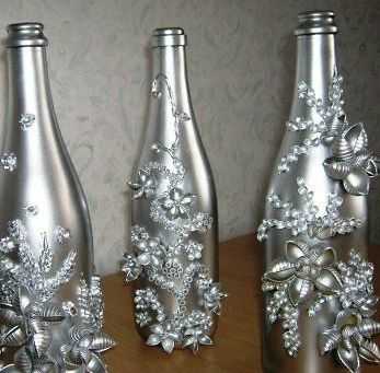 Обыкновенные стеклянные бутылки от вина и шампанского можно превратить в изысканные вазы. Покрасить бутылки можно с помощью специальной эмали, красок и нехитрых навыков рисования.