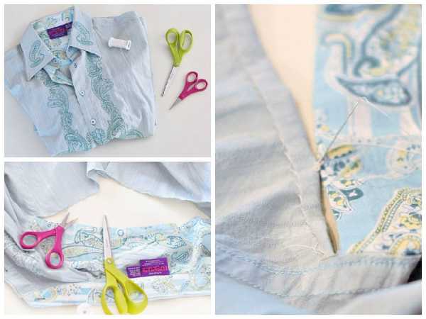 Выворачиваем рубашку наизнанку и используем ручку, чтобы отметить горизонтальную линию, где мы хотим сделать разрез. Разрезаем ткань по линиям швов. Выворачиваем рубашку и загибаем несколько миллиметров ткани внутрь. Закалываем булавками и сшиваем невидимыми стежками. Заглаживаем утюгом и оригинальная рубашка готова!