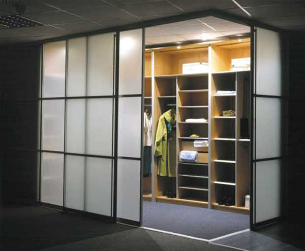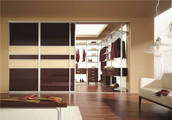 Двери гардеробной могут быть стандартными – распахивающимися, но тогда они будут занимать много места, а могут быть «гармошкой» – раздвижные. Для мини-гардеробных предпочтительней раздвижные двери, хотя они и требуют более сложного монтажа.