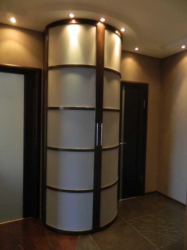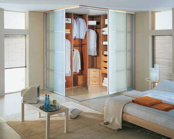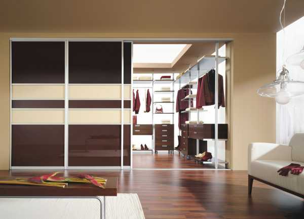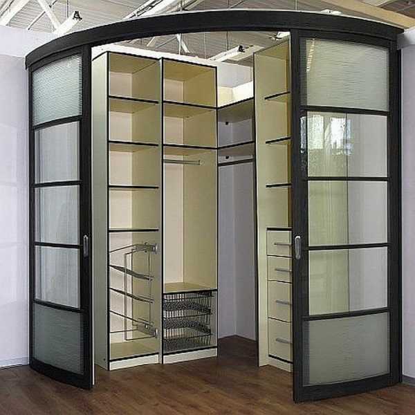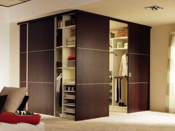 Если гардероб делают в проходной комнате, фасады шкафа закрывают дверями.