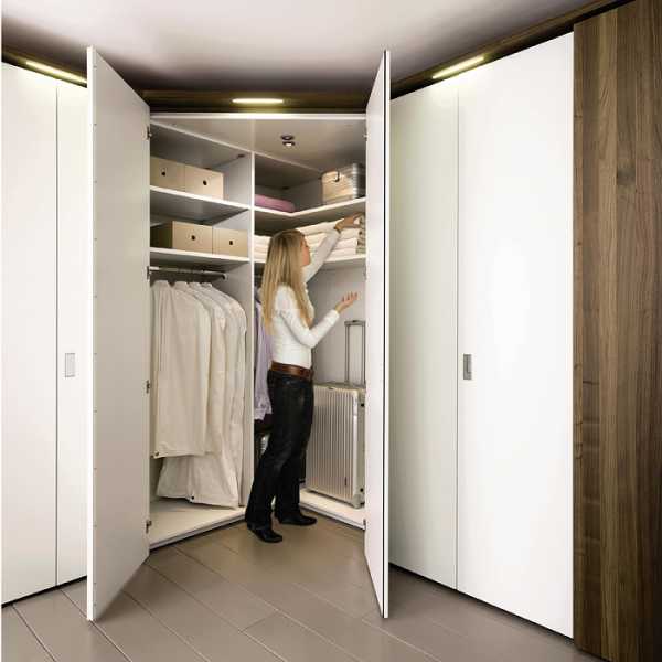 Отличной идеей может стать угловой гардеробный вариант, который подойдет к квадратному помещению и использует его площадь более рационально.