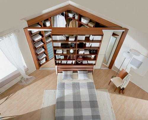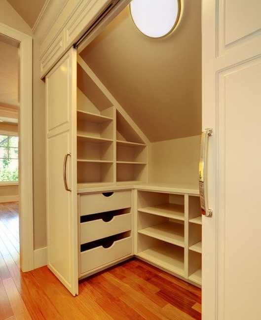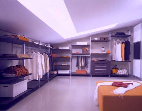 Размещая гардероб в мансарде, следует выбирать часть помещения с высотой не менее 1 метра. Иначе разместить все необходимое будет проблематично.