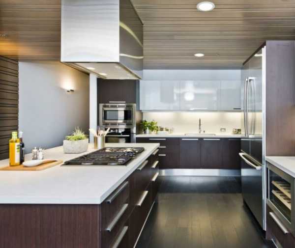 - Вытяжной короб необходимо прокладывать через всю старую кухню. Если вы хотите скрыть его, то проще всего это сделать, установив подвесной или натяжной потолок. Однако этот вариант можно реализовать только в достаточно высоком помещении.